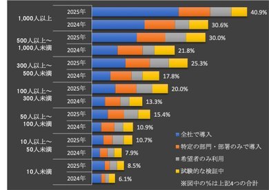 情報通信総合研究所は2025年9月4日、企業における生成AI(人工知能)導入の現状と展望に関するアンケート結果を発表した。導入は大企業が先行し、中小企業では低調が続く。従業員の個人利用率は14.9%(前年8.4%)に伸びた。