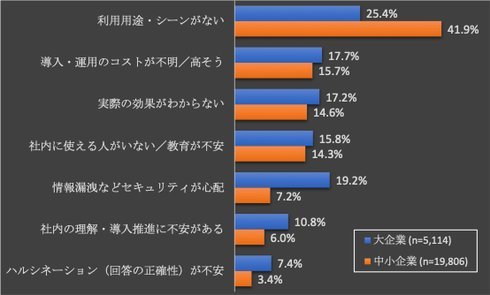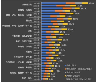 調査は、同年7月11〜17日に実施。全国の就業者に対して行い、9万6156人から回答を得た。業種別では、情報通信業や金融業、保険業が先行する一方、運輸業、郵便業や各種サービス業は依然10%前後にとどまる。未導入の理由は「利用用途、シーンがない」が最多で、中小企業で顕著となっている。大企業では「情報漏洩などセキュリティが心配」が次点に挙がる。