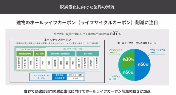 国内外における全CO2排出量のうち建築/建設分野が37%を占めるといわれている。建築物の資材調達から解体/廃棄に至るまでのライフサイクル全体で排出されるCO2排出量「ホールライフカーボン」は、「エンボディドカーボン」と「オペレーショナルカーボン」で構成される。