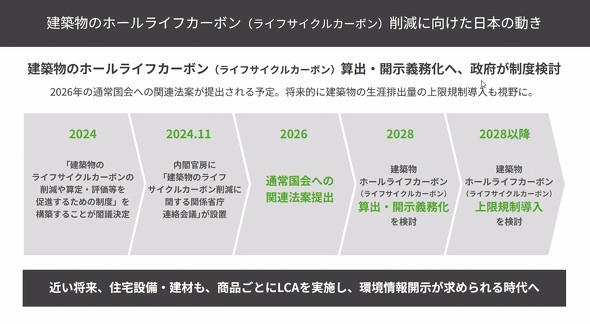 これらの状況を踏まえて、日本政府は建築物のホールライフカーボンの算出/開示義務化に向けて、制度の検討を進めている。2026年に通常国会に関連法案が提出される予定だ。