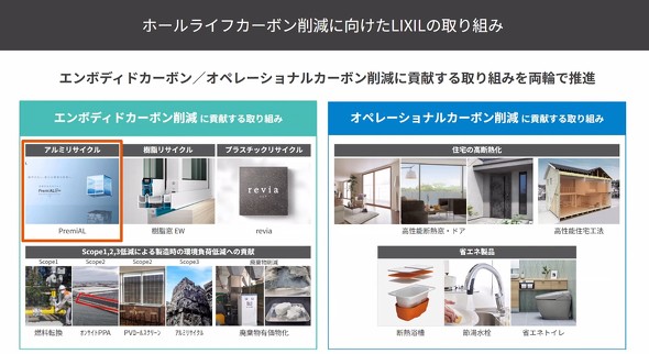 LIXILは2025年9月17日、オンラインで記者会見を開き、アルミ新地金のみで製造した場合と比較してCO2排出量を約50%減らせる循環型低炭素アルミ「PremiAL」を、標準品として価格据え置きでアルミ形材製品に展開すると発表した。対象製品は、LIXILが製造するアルミ形材を使用している全製品で、2025年10月から順次展開する。