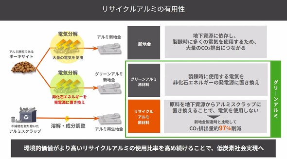 また、日本アルミニウム協会は2025年6月にグリーンアルミの定義を定め、低炭素製品への取り組みを一層強化している。アルミ製品の環境負荷を減らすためにポイントとなるのが、新地金を使用しないリサイクルアルミの活用だ。アルミは他の金属と比べると融点が低いため、少ないエネルギーで溶解して再資源化できる。アルミ製品の原材料を、新地金からリサイクル材に置き換えることで、CO2排出量を97%減らせる。