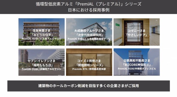 PremiALシリーズはこれまでに、建築物のホールカーボン削減を目指すさまざまな企業(住友林業、大成建設グループ、日鉄興和不動産、セブンイレブンなど)に採用されている。