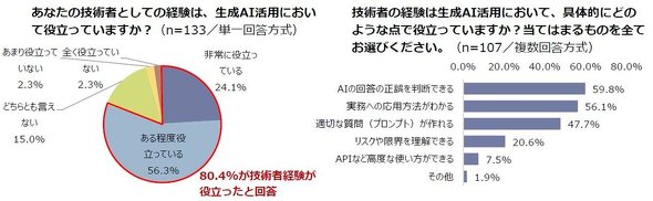 経験知との相乗効果も明確になった。80.4%が、技術者としての自分の経験がAI活用に役立つと回答している。具体的には「AIの回答の正誤を判断できる」(59.8%)、「実務への応用方法がわかる」(56.1%)、「適切な質問(プロンプト)が作れる」(47.7%)などで役立っているとの回答が多かった。