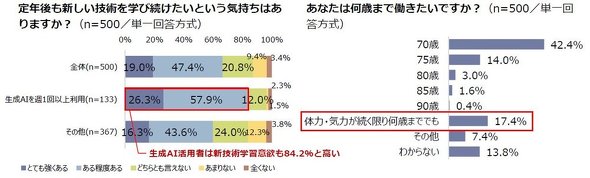 また、60代技術者は学習意欲が高い。定年後も新技術を学び続けたい人は全体の66.4%を占め、AIを週1回以上利用する人に限ると84.2%に達した。何歳まで働きたいかについては、最多回答が「70歳」で42.4%だった。「気力、体力が続く限り何歳まででも」の回答も17.4%あった。