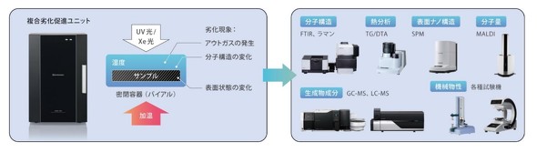 そこで、島津製作所はCDAS-1000を開発した。CDAS-1000は、島津製作所製のガスクロマトグラフ質量分析計(GC-MS)やフーリエ変換赤外分光光度計(FT-IR)、ラマン分光度計、示差熱/熱重量(TG/DTA)同時測定装置、走査型プローブ顕微鏡(SPM)、マトリックス支援レーザー脱離イオン化飛行時間形質量分析計(MALDI-TOFMS)などと組み合わせて利用することで、材料の劣化評価が行える。