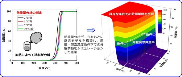 東レリサーチセンターは、温度と時間、酸素濃度などのさまざまな条件下におけるプラスチックの分解挙動を予測する解析手法を開発した。プラスチックの熱分解に伴う重量減少の実験データを基に構築した数式モデルを使用する。