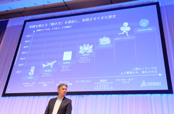ダッソー・システムズは過去40年の間に、3D設計、3Dデジタルモックアップ、PLM、3DEXPERIENCEプラットフォーム、バーチャルツインといったイノベーションを時代の流れとともに提供してきた。そして、こうした進化の先に、現在同社が取り組む「ジェネレーティブエコノミー(生成経済)」があるという。