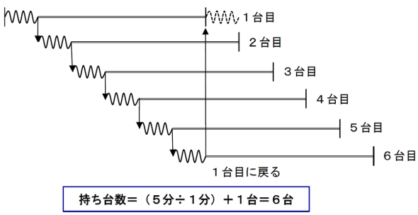 作業者が複数台の機械設備の操作を担当する台数の可能性を分析する手順は以下の通りです。先述した多工程持ち分析も同様の手順になっています。