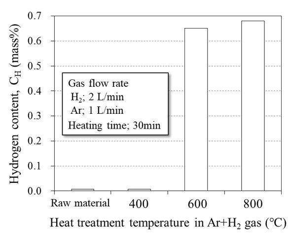 横型管状炉内にH2ガスとアルゴン(Ar)ガスの混合ガス(流量比H2:Ar=2:1)を流入した状態でTi64切削くず試料を充填し、400℃、600℃、800℃の各温度で30分間保持する熱処理を施した。まず、各試料の水素含有量の定量分析とX線回折(XRD)による水素化合物相の同定を行った。それぞれの解析結果を図3と図4に示す。