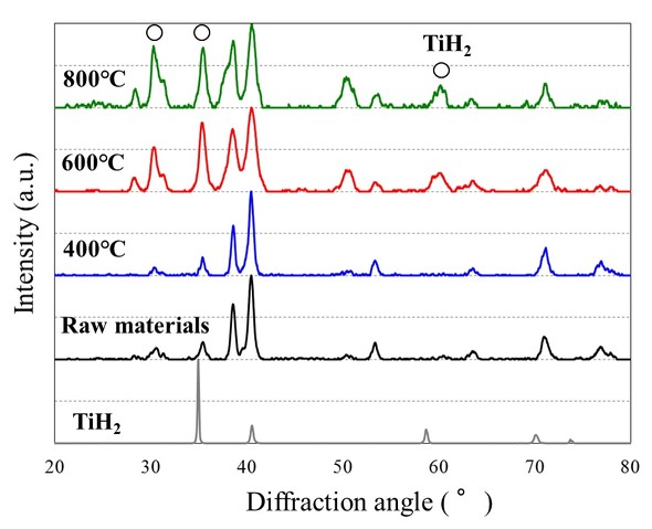 また、XRD結果において600℃と800℃での熱処理サンプルでは、原料の切削くずには検出されないTiH2相に対応する回折ピークが明瞭に確認される。しかしながら、400℃熱処理材では、TiH2相の回折ピークは検出されなかった。これらの分析結果を踏まえると、600℃以上の水素熱処理によりTi64切削くずにおけるTi成分がH2ガスと反応し、所望の水素化合物(TiH2)が生成したと結論付けられる。