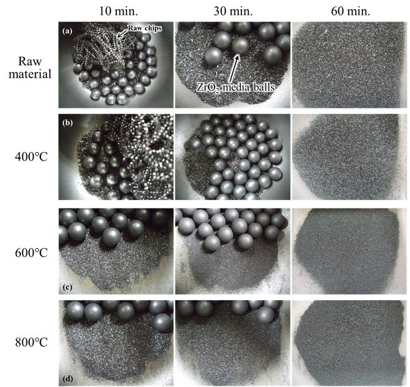 ここでは、回転速度を200rpm、加工時間を10、30、60分の3水準とし、粉砕効率を高めるために直径10mmのジルコニア(ZrO2)ボールを原料とともにミル容器に投入した。まず、容器内における切削くずの粉砕状況を目視にて観察した(図5)。TiH2相を含まない出発原料と400℃熱処理サンプルでは、10分経過後においても旋状の連続した切削くずが多量に残存している。