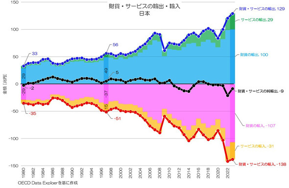 それでは、これらを踏まえた上で、日本の貿易は現在どのような状況なのでしょうか。まずは、全体的な推移から見てみましょう。図1は日本の財貨とサービスの輸出、輸入を示しています。