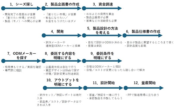 これまでの連載では、自社オリジナル製品をODM(設計製造委託)するためのいくつかのポイントを深掘りして解説してきたが、製品化全体の流れは理解しにくかったかもしれない。そこで本稿では、スタートアップが自社オリジナル製品を作ると決めてから量産を開始するまでを、時系列で解説する。