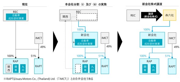 事業譲渡の手順は以下の通りだ。RECの完全子会社であるレゾナック・オートモーティブプロダクツ(RAP)が、同社の関西事業所において営む事業を、吸収分割によりRECに対して承継させる。次にRECが、同社の自動車成形部材事業、RAPの全発行済み株式とタイのResonac AutomotiveProducts(RAPT)のREC保有持分の全てを、吸収分割によりRECが新たに設立する完全子会社に対して承継させる。これらの会社分割を通じて対象事業が集約された新会社の株式の全てを、森六社に譲渡する。