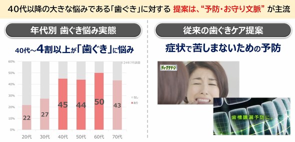 「約40℃の温感がじんわりと口内に広がるユニークな処方だ。歯を磨いているうちに歯ぐき組織修復成分であるALCAが歯ぐきの奥まで届き、内側まで浸透する。これにより、歯周病を予防し、血色がよく張りのある歯ぐきに導く」(鈴木氏)