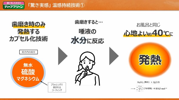 ディープクリーン 薬用温感ハミガキは、歯ぐき組織修復成分「アラントインクロルヒドロキシアルミニウム(ALCA)」が配合されている。加えて、油溶性成分でコーティングした無水硫酸マグネシウム(基剤)を配合した非水系温感持続処方により、3分間の温感を実現する。具体的には、油溶性分が歯磨きの際にブラッシングで剥がれ、無水硫酸マグネシウムが唾液の水分に反応し発熱する。