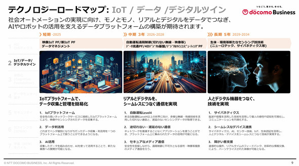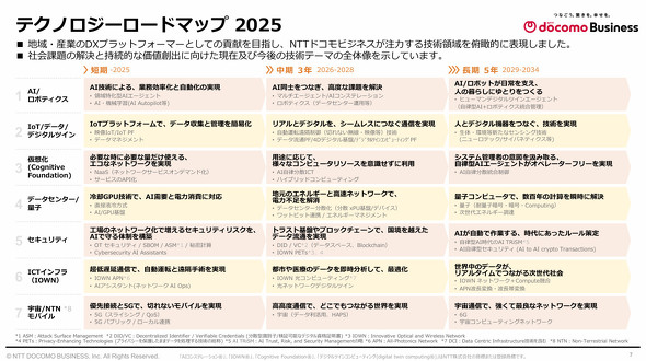 NTTドコモビジネスは2025年9月17日、2034年までをターゲットとした「テクノロジーロードマップ 2025」を公開した。社会課題解決に向け「AI/ロボティクス」「IoT/データ/デジタルツイン」「仮想化」「データセンター/量子」「セキュリティ」「ICTインフラ」「宇宙/NTN(Non-Terrestrial Network)/モバイル」の7つの分野で2030年までの展望を示している。