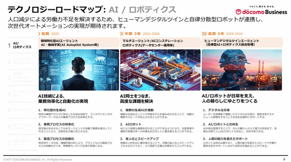 NTTドコモビジネスは、2034年までをターゲットとした「テクノロジーロードマップ 2025」を公開した。2034年には生体通信が普及し、AIロボットが生活のあらゆる局面を支援する世界を描く。