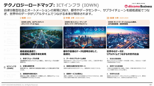 その他では「ICTインフラ」では「IOWN」の普及による高度で安定した通信環境により得られる利点を訴える。短期では、IOWN APN、AIアシスタントなどにより、超低遅延通信で、自動運転や遠隔手術の実現を支援する。中期では、IOWN光コンピューティングにより、都市や医療のデータを即時分析し、データのリアルタイム統合や医療サービスの向上を実現する。長期では、IOWNネットワークとCompute融合により、世界中のデータがリアルタイムでつながり、安全な自動運転や連携する生産機器を実現すると予測する。