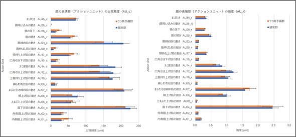 AI(人工知能)解析ツール「OpenFace 2.0」で表情筋の動きを調べると、眉や口元の筋肉に特徴的な動作パターンが確認された。うつ症状の程度を示すBDI-IIスコアが高いほど、特定の筋活動が強まり、出現頻度も上昇した。