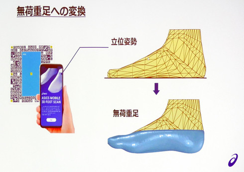 また、立位姿勢で計測した足形には自重による変形が含まれる。このため中敷きの設計には無負荷状態でのデータ(無荷重足のデータ)が必要となる。アシックスは立位データを無荷重状態に変換するアルゴリズムも開発し、より正確な3Dデータを生成できるようにした。