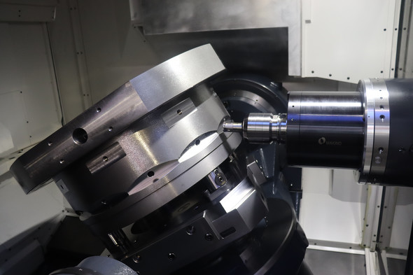 a630iTは630×630mmのパレット、毎分1万回転可能な50番の主軸を備え、最大で径1000×800mm、1トンのワークに対応するトラニオンテーブルを搭載している。重量ワークの加工でもA軸はー195〜+45度の傾斜範囲を実現。テーブルのA軸のサポートをコンパクトにしたことで、作業者のワークへの接近性と視認性を確保している。