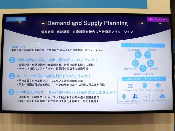 「サプライチェーン全体エリア」では、流通/製造業における「需要/供給/在庫」の計画業務を、AI(人工知能)を活用してサポートする計画系ソリューションを披露した。同エリアのソリューションは、組織や企業といった壁を越えたタイムリーな情報連携を可能にし、パナソニック コネクトが掲げるデータ連携の概念を体現している。