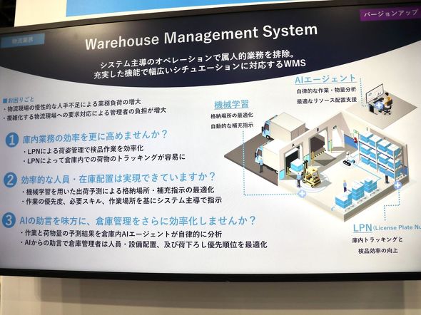「倉庫ソリューションコーナー」では、現場に合わせて段階的な倉庫業務改革が実現できるWMS(倉庫管理システム)を披露した。アナログな現場だと、熟練の作業者が状況を見て判断を下して作業をするという、属人的な対応が求められる。近年、短期的に作業ができる人をスポットワークサービスを経由して募集する企業も増えているが、現場をきちんと標準化して誰がやっても同じ作業ができる環境にしておかないと、重大な作業ミスが発生して大きな事故につながる可能性がある。