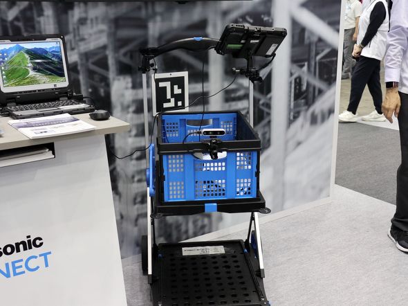 「デモンストレーションエリア」では、WESと連携させてピッキングを効率化する「自律走行搬送ロボット連携」を参考出展した。ピッキング作業リストや計画に基づき、ロボットが次に何をすればいいのかを案内してくれる。人間の作業者はロボットに追従して動くだけで、効率的にピッキング作業ができる。