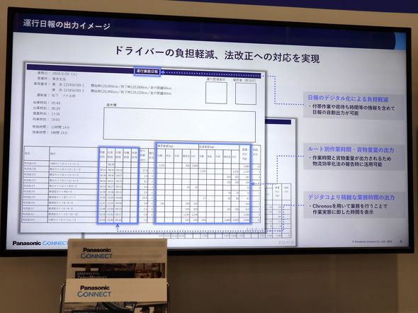 「輸配送ソリューションコーナー」では、2024年4月に施行されたいわゆる「物流新法」に伴い発生している課題を解決するための配送業務改革ソリューションを披露した。小笠原氏は「物流新法によって必要になった、荷待ち時間や作業実態を報告書で提出するという一連の業務をサポートできるようにしている」と語る。