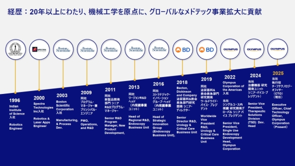 オリンパスに入社したのは2022年で、2024年までの2年間は米国法人において重点プロジェクトの一つであるシングルユース内視鏡の研究開発に携わっていた。現職の執行役 CTOには2025年4月に就任。米国から家族とともに東京に転居して、研究開発拠点でもある八王子のグローバル本社で勤務している。