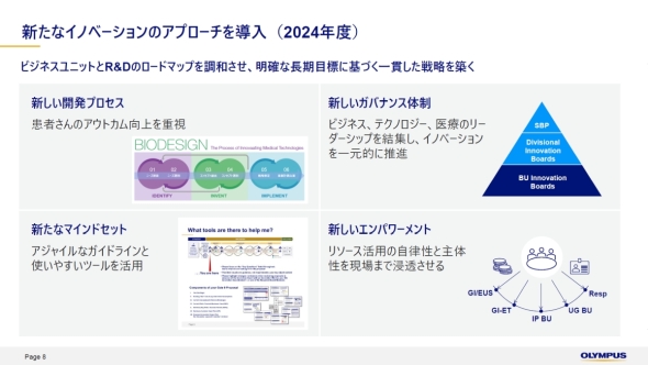 CTOビジョンにおいて重視されているのがイノベーションだ。オリンパスはビジネスユニットとR&Dのロードマップを調和させ、明確な長期目標に基づく一貫した戦略を築くことを目的に2024年度から新たなイノベーションのアプローチを導入している。ナヴィード氏は「これまでオリンパスのR&Dはハードウェア志向が強かったが、今後の差別化の大きな要因になっていくであろうソフトウェアを重視した変革を進める上でもイノベーションは重要な役割を果たす。また、イノベーションを長期にわたって創出するためには組織やカルチャーを変革していくことも必要だ」と強調する。