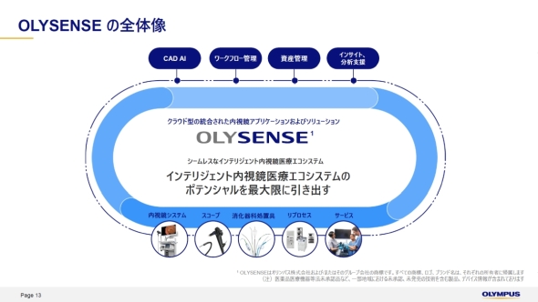 OLYSENSEは、シームレスなインテリジェント内視鏡システムの医療エコシステムを構築するためのフレームワークだ。これまでスタンドアロンのハードウェアとして運用されてきた内視鏡システムをクラウドとつなぐことにより、データとAI(人工知能)を活用して臨床アウトカム(成果)の改善と業務効率の改善を支援するインテリジェント化が可能になる。