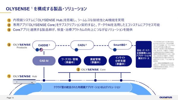 OLYSENSEでは、内視鏡システムの本体に「OLYSENSE Hub」をつなぐことでクラウドと接続できるようになる。クラウドと接続によって、オリンパス傘下のOdin Visionが手掛ける「CADDIE」「CADU」「SmartIBD」などの医療AIの利用が可能になる。また、専用アプリである「OLYSENSE Core」をサブスクリプション契約すれば、ワークフロー管理や資産管理、インサイト分析支援などのアプリケーションも利用できる。これらの医療AIやアプリケーションについては、オリンパスグループだけでなくパートナー企業開発のものを用意するなどしてエコシステムを拡充させていく方針である。なお、OLYSENSEの市場投入については「まずは欧州で上市することになるが、早期に日本でも展開していきたい(ナヴィード氏)という。