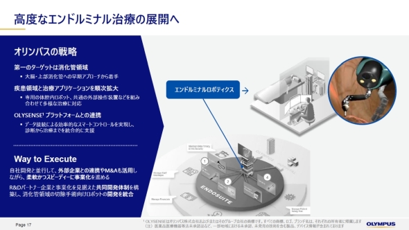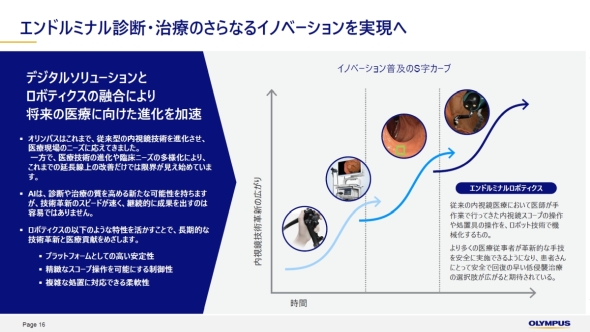 オリンパスは、内視鏡技術におけるイノベーション普及の推移として、まずOLYSENSEによるデータやAIの活用が進んだ後に、エンドルミナルロボティクスの導入が始まると見立てている。その上で、現時点では大腸内視鏡向けでの開発に注力している段階にある。