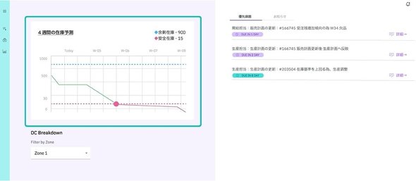 第1の特徴は、分散するデータの統合とリアルタイム分析で、第2はAIによる洞察と対応策の提示だ。需要変化に伴う生産計画や損益影響への対策を示す。第3の特徴は在庫最適化で、将来の変動を予測し過剰在庫の10〜15%程度削減も見込めるという。