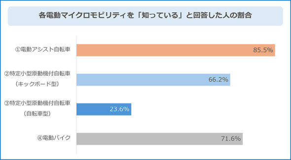 どの電動マイクロモビリティを知っているかとの調査では、電動アシスト自転車がトップの85.5%、次が電動バイクで71.6%との回答であった。特定小型原動機付自転車に関してはキックボード型が66.2%で、カテゴリー中最下位は自転車型で23.6%であった。利用したことがあると回答した人の比率は、電動アシスト自転車が25.1%、電動バイクは10.6%であった。一方、特定小型原動機付自転車に関しては、キックボード型・自転車型ともに5%を下回った。