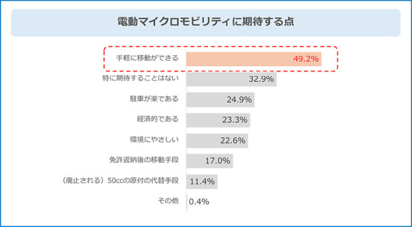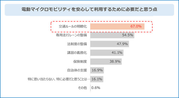 期待する点のトップ3は、手軽に移動ができるが49.2%、特に期待していないが32.9%、駐車が楽が24.9%であった。また、今後安心して利用するために期待される点に関しては、交通ルールの明瞭化(67.0%)、専用走行レーンの整備(54.5%)、法制度の整備(47.9%)が上位3つとなり、電動マイクロモビリティの手軽さを評価する一方で、安全性を確保するためには交通ルールの明瞭化や法律、インフラの整備が必須であるとの声が多かった。