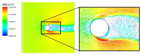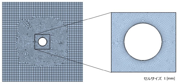 それでは、表3の条件に基づいて解析を行ってみましょう。図8にセル分割図を示します。円柱周りのセル厚さは、かなり薄くしています。乱流モデルはSSTです。