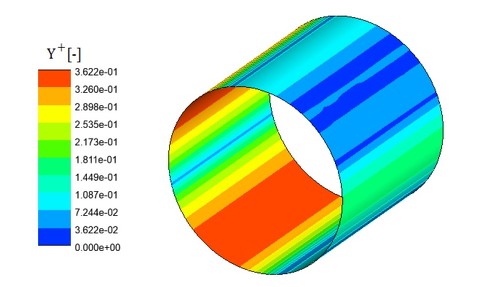 Y+をチェックしておきます。その結果を図10に示します。壁面第1層のセルをかなり薄くしたため、Y+の値は小さくなりました。Y+に対する要求値は2〜3[-]以下であるため、これでよしとします。