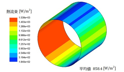 図12に、壁面の熱流束分布を示します。伝熱界面における平均値は858.4[W/m2]でした。