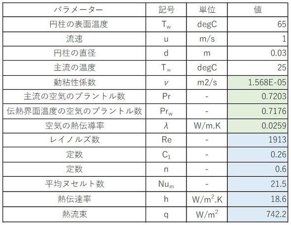 ヌセルト数に、添え字「m」が付いています。円柱の風が当たる面と後方の面とでは熱伝達量が異なるため、ヌセルト数も異なりますが、式9は円柱全体の平均という意味です。表3に、強制対流熱伝達における熱伝達率の計算例を示します。