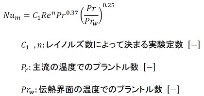 風の中に置かれた円柱の熱伝達のヌセルト数を求める式はいくつか存在しますが、今回はZukauskasの式を用います(参考文献[1])。式9に示します。
