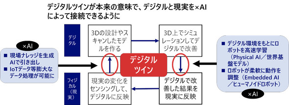 これらの課題が、生成AIやフィジカルAIとの融合の中で大きく変わろうとしている。「フィジカルからデジタルへ」という面では、暗黙知となっていた現場ナレッジを生成AIでデータとして整形し、引き出せるようになった。またIoTデータなどの多岐にわたる種類の膨大なデータを容易に整理し活用することが可能になることでデジタルツインがシステムとして自動でつなげられるようになってきた。