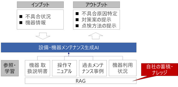 例えば、暗黙知となっていた現場ナレッジを生成AIで活用できるようになった事例としては、オムロンの取り組みなどがある。オムロンでは、設備保全のノウハウや過去のトラブル報告書などを生成AIにRAG(検索拡張生成、Retrieval Augmented Generation)の形で参照させ、機器トラブル時に原因や対策をAIに出力させているという。