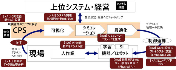 加えて、デジタル側から現実へのフィードバックについても「×AI」でスムーズな連携を実現するため、具体的な取り組みが進もうとしている。例えば、ロボットや自動運転車におけるAIの学習には、まず基盤となる学習環境を構築することが大変だが、これらを効率的に行えるように学習対象の3D環境を合成し高速で学習できる世界基盤モデル(World Foundation Model)構築などが進んでいる。これらを生かしつつ、物理法則を学習するフィジカルAIの取り組みも活発化している。