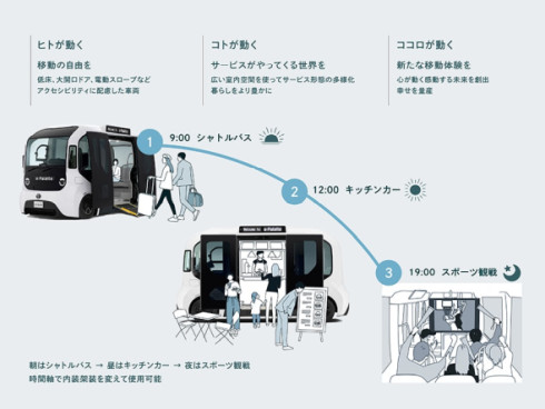 例えば朝晩はシャトルバス、昼間は充電しながら店舗営業など、1日の中で用途を切り替えて活用できる。加えて、広い車室空間に架装を施すことで、さらに多様な用途に対応できる。例えば遠隔通信や音響機材などを搭載して、移動中もスポーツ観戦を楽しんだり、観光を楽しんだりできるエンターテインメント車両としても利用できる。
