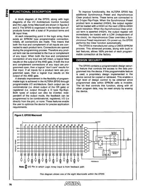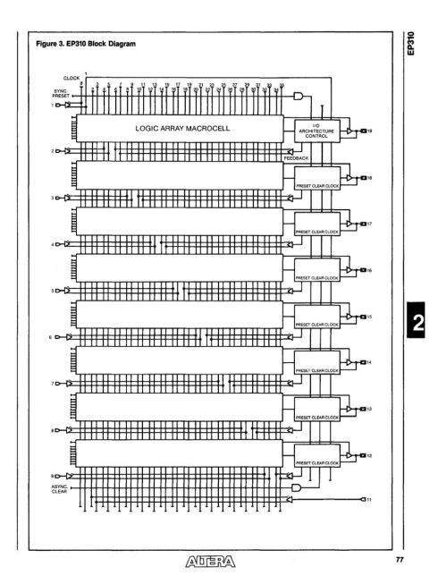 図1 EP310のMacrocellのデータシート(いろいろと探したがEP300のデータシートは見つからなかったので代わりに)。構造そのものはEP300とほぼ変わらない。1〜9+11番ピンがInput(1はClockと共用)、12〜19番ピンがInput/Outputとなっている[クリックで拡大] 出所:Altera Data Bookそして、このMacrocellを8つ搭載したものがEP300という構造になっている(図2)。