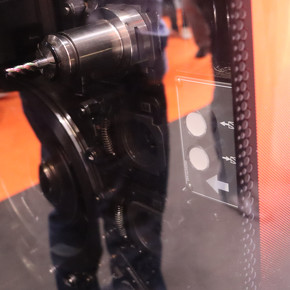 複合加工機「INTEGREX j-200S NEO」は欧州初出展となる。同社の機種ではエントリータイプに当たり、旋削主軸の出力、トルクを向上させたことで高い生産性を実現している。標準仕様、ハイパフォーマンス仕様ともに、ミル主軸のB軸割り出し範囲を従来機よりも拡大し、さらに割り出し角度も標準仕様で1度単位、ハイパフォーマンス仕様で0.0001度まで可能としている。また、ハイパフォーマンス仕様では、従来機から大幅に出力、トルクを向上させながらも、全長を短縮したミル主軸を採用している。「日本では既に販売しているが、欧州のリクエストに応えて仕様などを見直しており、欧州で販売を拡大させていきたい」(田中氏)。